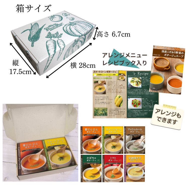 雪にんじんポタージュ・スイートコーンポタージュ・マッシュルームポタージュ・かぼちゃポタージュ・トマトポタージュ・安納焼き芋ポタージュ各1箱入りです。